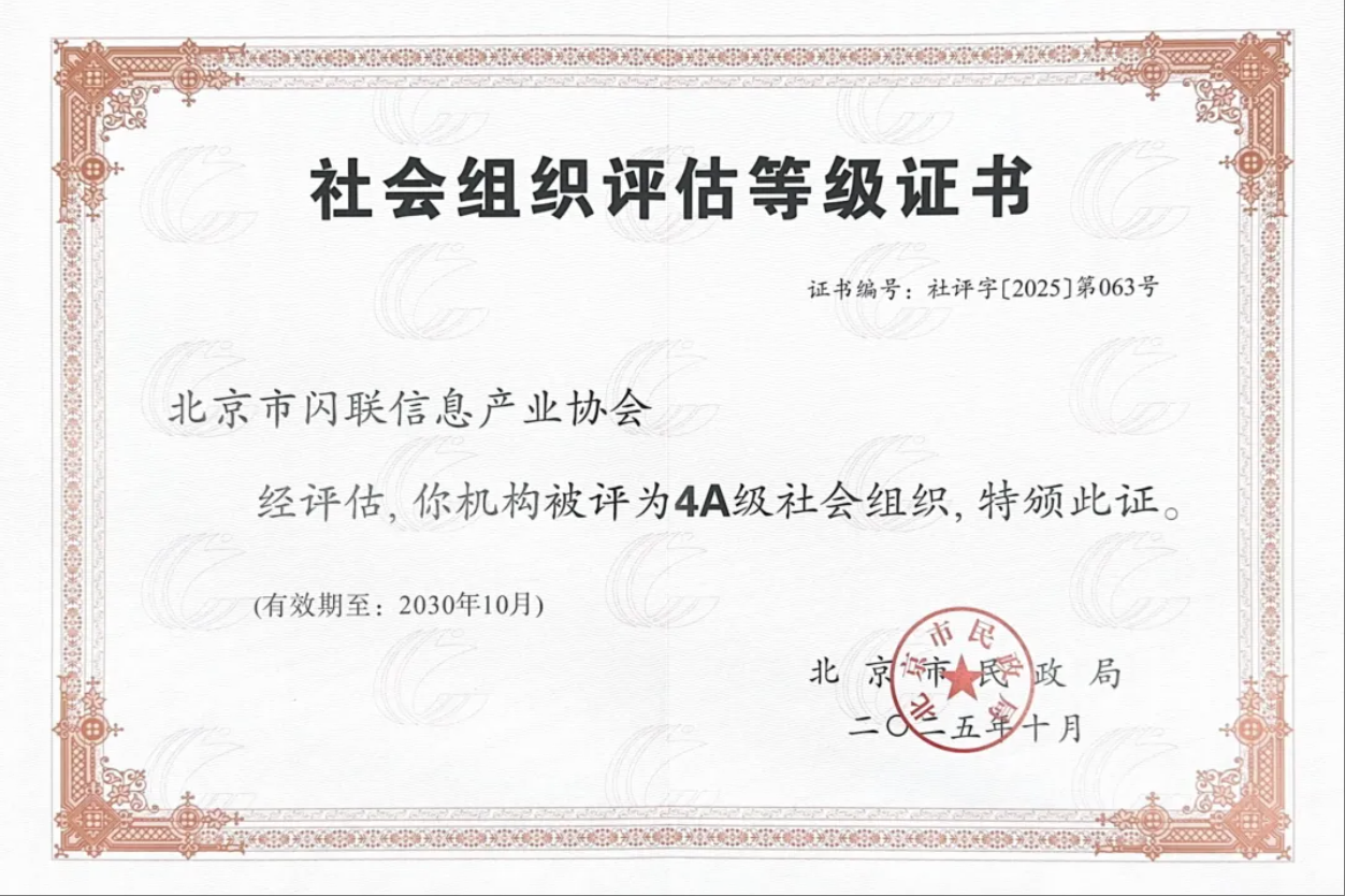 11月3日,北京市民政局正式向北京市闪联信息产业协会颁发“4A级社会组织”牌匾及证书,标志着协会在2025年度北京市社会组织评估中获得权威认定,综合实力与服务成效获充分肯定。