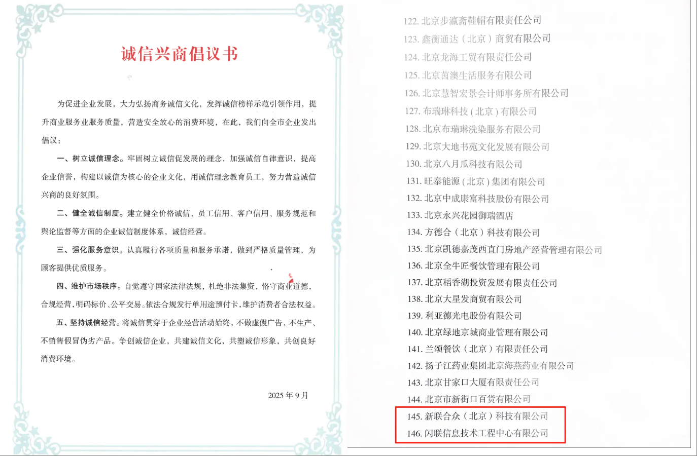 近日,由北京市商务局主办的2025年“诚信兴商”北京主题日活动成功举办。本次活动以“诚实守信 利企惠民”为主题,旨在弘扬诚信文化,倡导企业诚信经营,共同营造安全放心的消费环境。来自政府部门、行业协会及相关企业的200余名代表齐聚一堂,共商诚信兴商大计。闪联信息技术工程中心有限公司与新联合众(北京)科技有限公司作为诚信经营典范企业,受邀出席本次活动。
