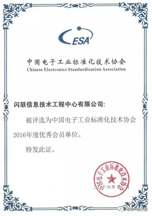 2017年1月12日,由工信部、国家标准化管理委员会指导,中国电子工业标准化技术协会、中国电子技术标准化研究院、中关村科技园区管理委员会主办的第九届电子信息产业标准推动会在北京召开。闪联荣获中电标协“2016年度优秀会员单位”,闪联牵头成立的“中关村标准化协会”入选中电标协“2016年度电子信息产业标准化十大事件”。