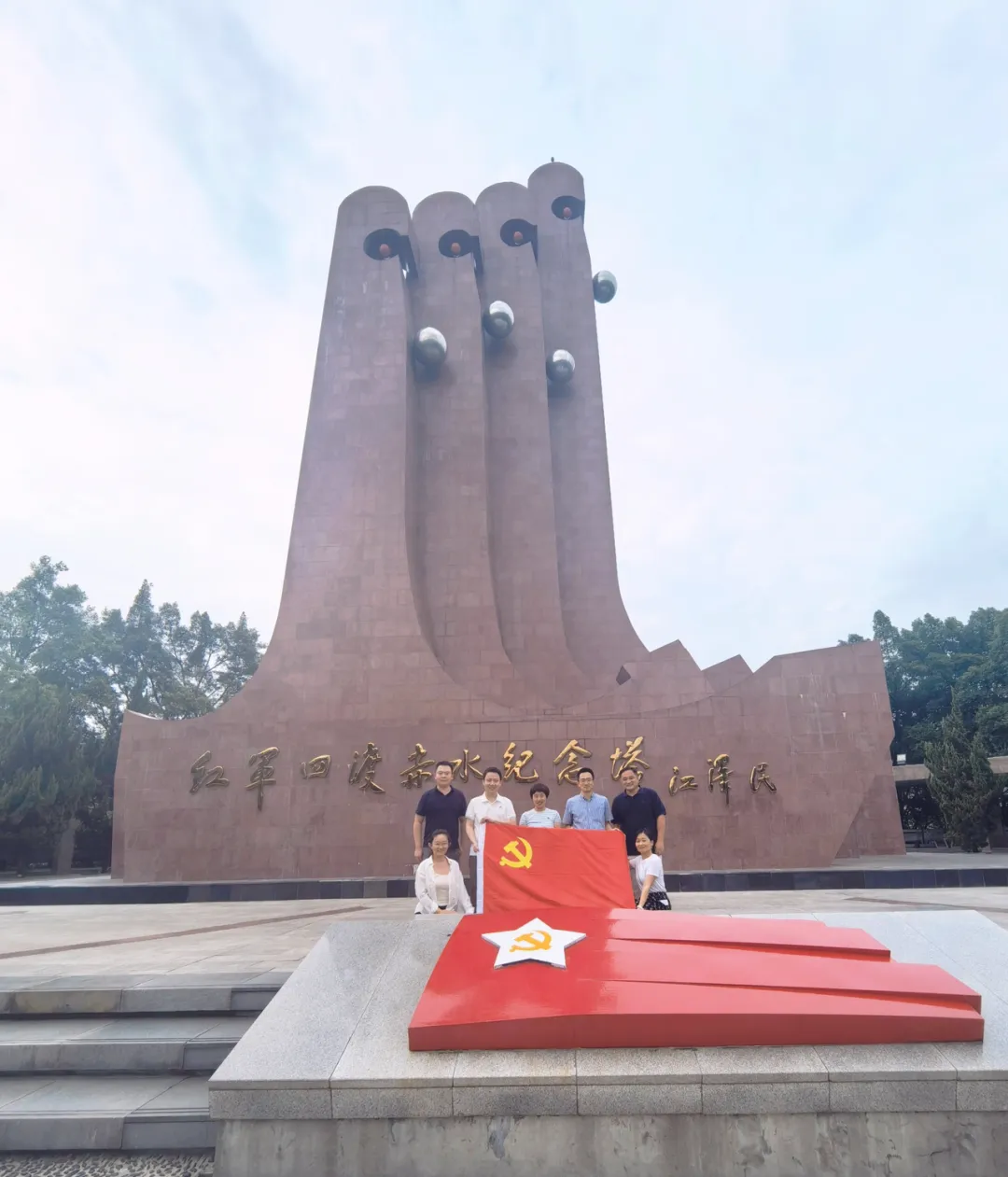 2025 年 9 月 19 日,贵州省仁怀市茅台镇赤水河畔,红军四渡赤水纪念塔巍然矗立。中国电子技术标准化研究院第九党支部第二党小组与闪联产业联盟企业联合党支部联合开展主题党日活动。相关党员、群众齐聚纪念塔前,以合影留念的方式回望峥嵘岁月,传承红色基因。